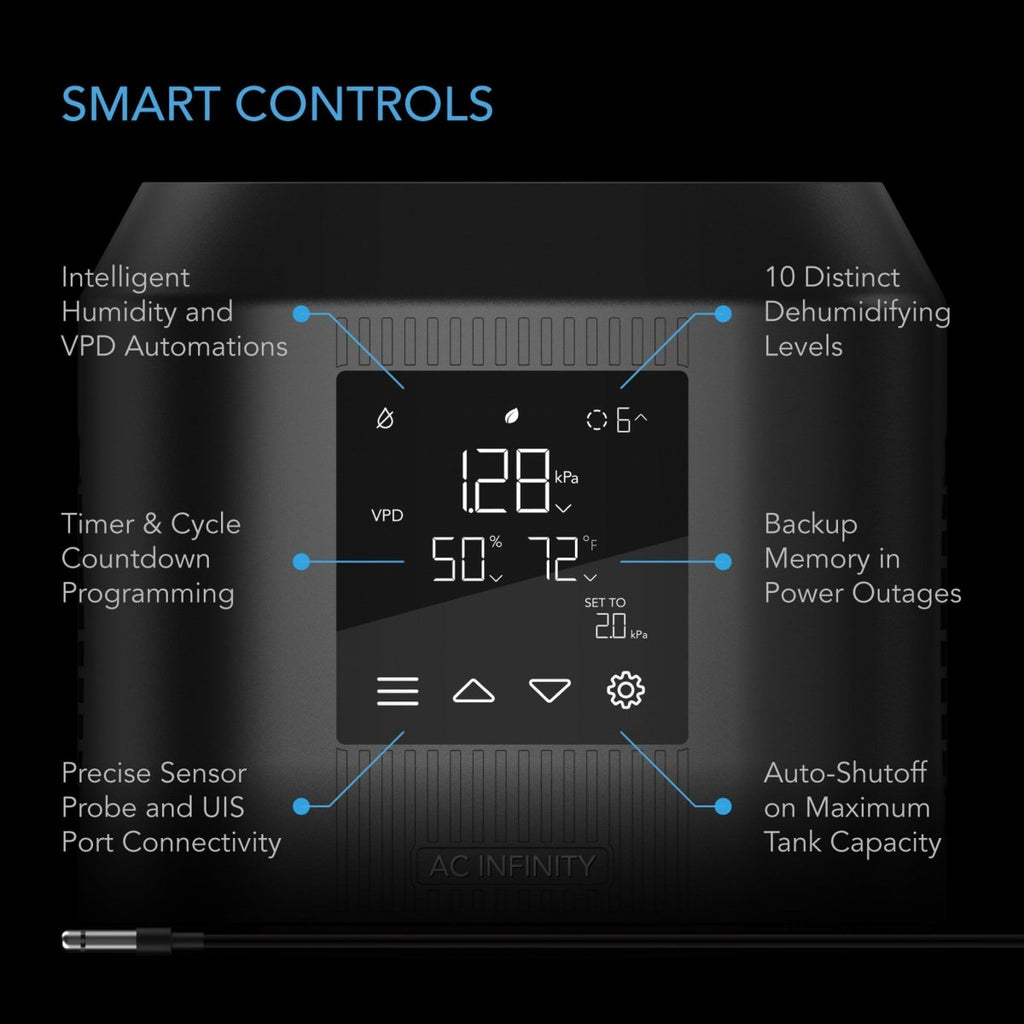 - Integrated onboard controller with corded sensor delivers VPD and humidity readings, trigger-based automation, timers, cycles, and auto shutoff when full.